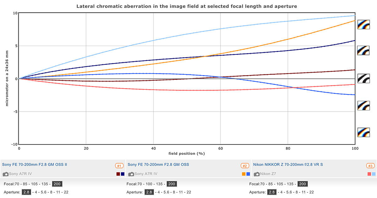 Overall, the new Sony FE 24-70mm F2.8 GM II is exceptionally well controlled in respect of lateral chromatic aberration. Some fringing may be noticeable at the periphery on high contrast edges at the shorter focal lengths (peak levels of around 11µm at 24mm), but given that the results are without profile correction this is very impressive for a zoom. Levels are very low and well-controlled across the image field even in the extreme corners through the zoom range out to 70mm, though that can also be said for the other two even if they’re not quite at the same low level as the GM II.