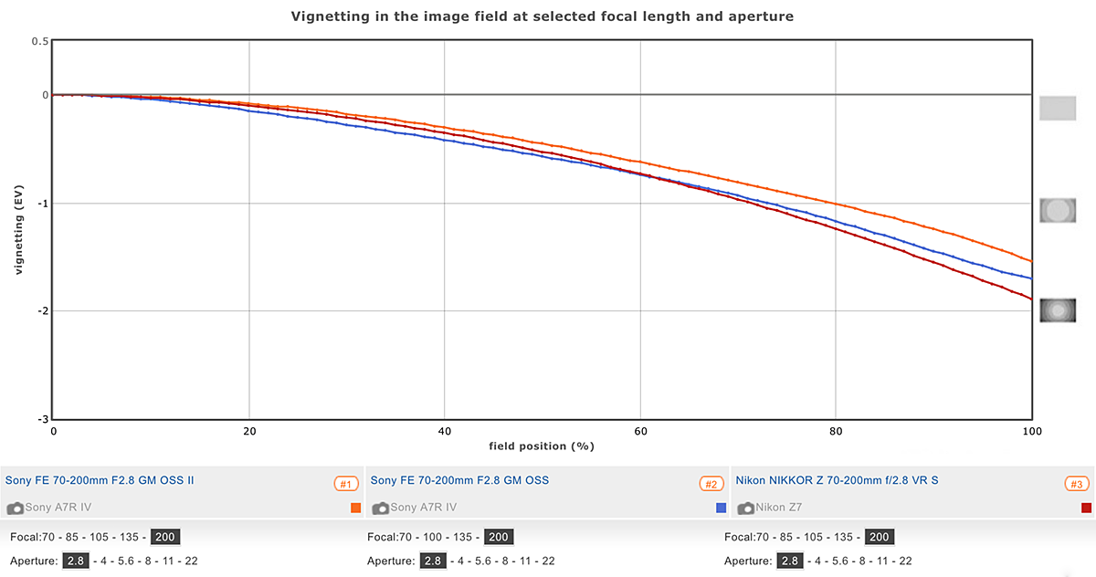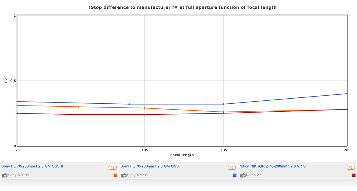Transmission is a good measure of the effectiveness of the lens’s coatings, and it’s useful to know if you’re using your lenses for video. Furthermore, it can even vary between camera models, so it’s worth taking that into consideration. With zoom lenses, uneven transmission can alter brightness levels during a change in focal length, so keep an eye out in our results for large deviations in brightness throughout the zoom range. In this regard, the Nikkor Z is highly consistent from 70 mm all the way through to 200 mm, varying just 0.1 EV over the range. The Sony is similar in that respect, but it also has the highest transmission of the three, averaging T2.9, versus T3.1 for the Nikkor Z.