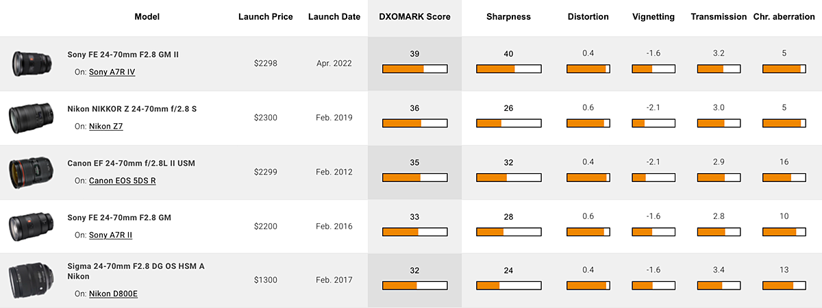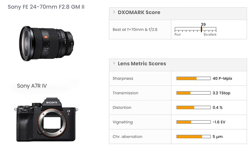 We tested the Sony FE 24-70mm F2.8 GM II on the 61 MP Sony A7R IV where the lens and sensor achieved an excellent overall DXOMARK score of 39 points. This rating places it at the top of recent test results for this focal range ahead of the original Sony GM lens and even slightly in front of the previous best models; the Nikon Nikkor Z 24-70mm F2.8 S and earlier, made for DSLR, Canon EF 24-70mm F2.8L IS USM.