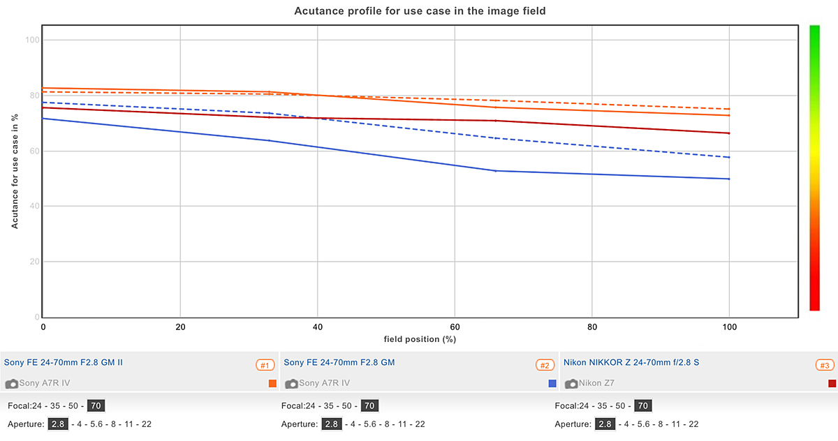 In this review, we have compared the Sony FE 24-70mm F2.8 GM II mounted on a Sony A7R IV to its closest rivals from other brands. Remember that the lenses may be used on various cameras with different sensors, or in some cases on different camera systems using different mounts, so the results will vary between them.