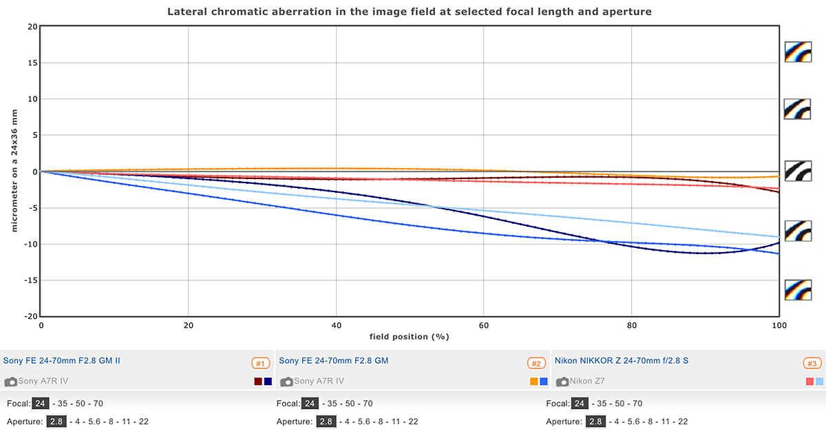 Overall, the new Sony FE 24-70mm F2.8 GM II is exceptionally well controlled in respect of lateral chromatic aberration. Some fringing may be noticeable at the periphery on high contrast edges at the shorter focal lengths (peak levels of around 11µm at 24mm), but given that the results are without profile correction this is very impressive for a zoom. Levels are very low and well-controlled across the image field even in the extreme corners through the zoom range out to 70mm, though that can also be said for the other two even if they’re not quite at the same low level as the GM II.