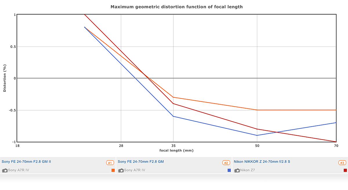 Distortion characteristics of the new Sony have also been improved. At its widest 24mm, the GM II has the equivalent 0.8 % barrel as its predecessor, but it’s lower than the Nikkor, which is approaching a rather high 1.0 % (before profile correction), and the GM II is better controlled than both throughout the range. At 28mm, barrel distortion is just 0.3 % changing to -0.3 % pincushion at 35mm. After that, pincushion increases slightly to -0.5% at 50mm through to 70mm. That’s all rather remarkable given the reduced size and weight over the original.