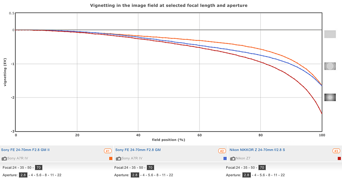 With the GM II’s smaller size, you might also expect higher vignetting but that’s not the case here. Overall, the new lens has about the same levels when averaged, however, the characteristics vary between the two models. The new GM II has about the same peak values and a slighter smaller central core free of vignetting than its predecessor wide open at 24-28mm, but then that position reverses over the 35-70mm range. The new lens also mitigates the effects sooner than the original on stopping down over the same 35-70mm range, though it’s about the same over the more noticeable 24-28mm range. Against the Nikkor, the GM II is slightly better controlled at every focal length.